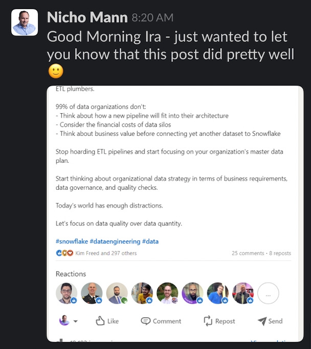 In 2025, I felt like I had figured out the formula — we were hitting 500K impressions, even for niche compensation content, and turning LinkedIn videos into customer acquisition flywheels.
